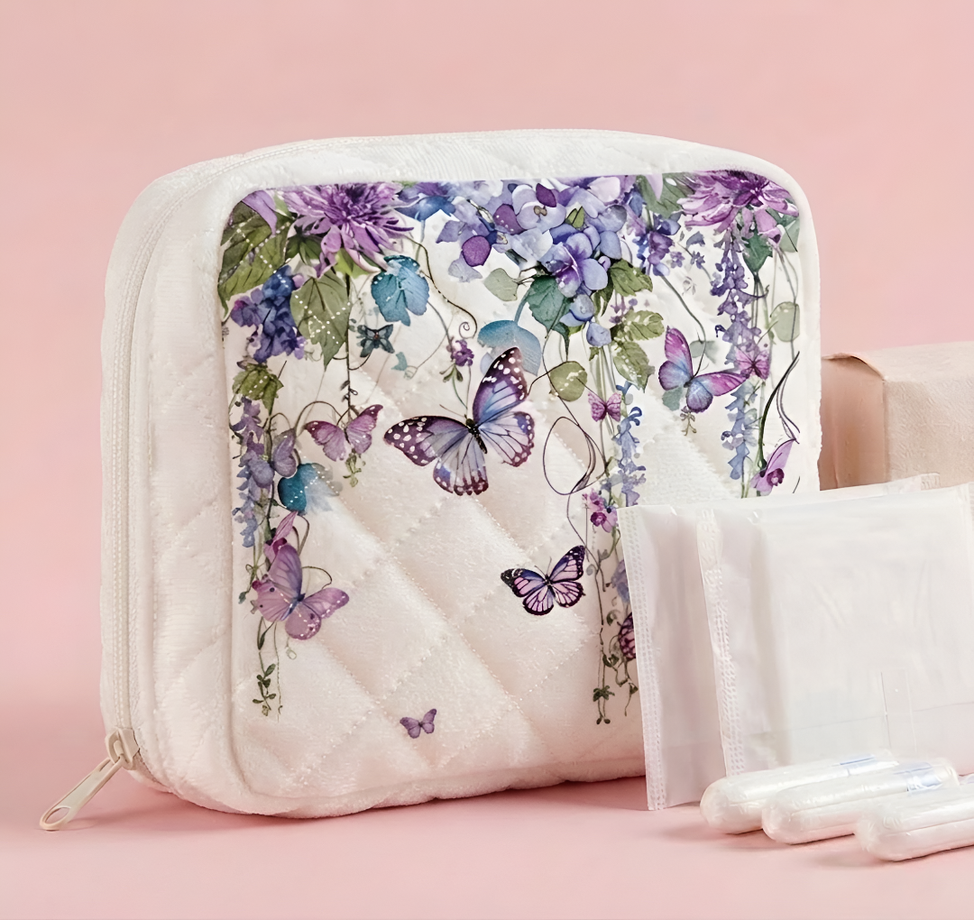 Ağ rəng, kəpənək detallı ped çantası həm funksional, həm də estetik baxımdan zərif bir aksesuardır. Yumşaq pudra tonu sakitlik, incəlik və rahatlıq hissi yaradır, üzərindəki motivləri isə dizayna sevimli və şirin bir görünüş qatır.